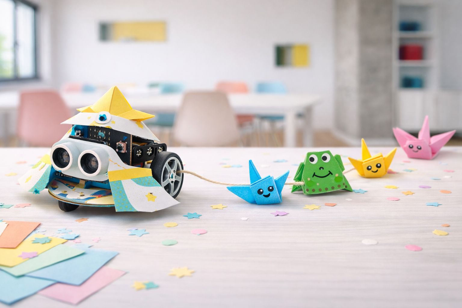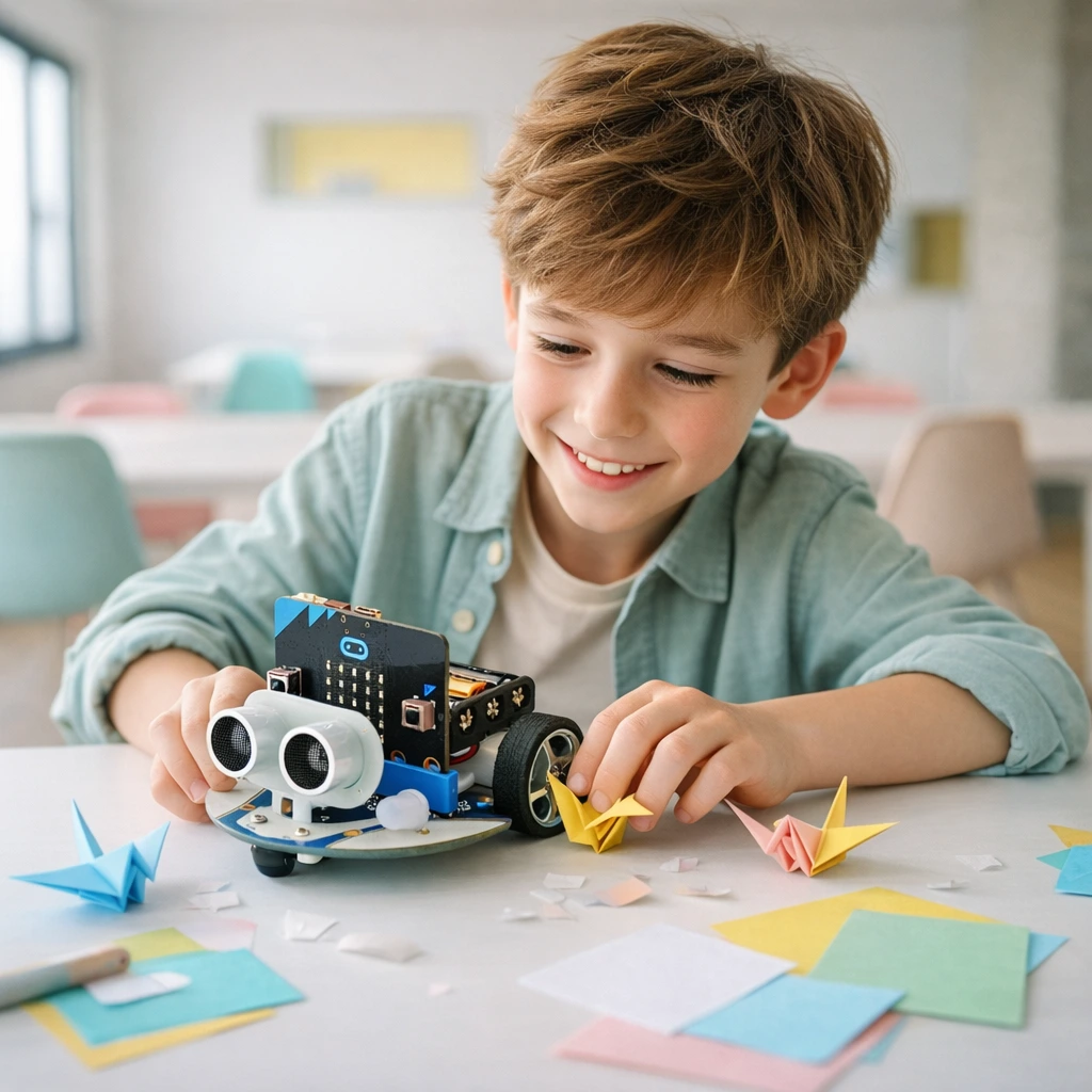 Juegos de lógica offline, diseño de disfraces con papel plegado (origami) y construcción de la identidad del robot. Las manos trabajan, la mente crea.